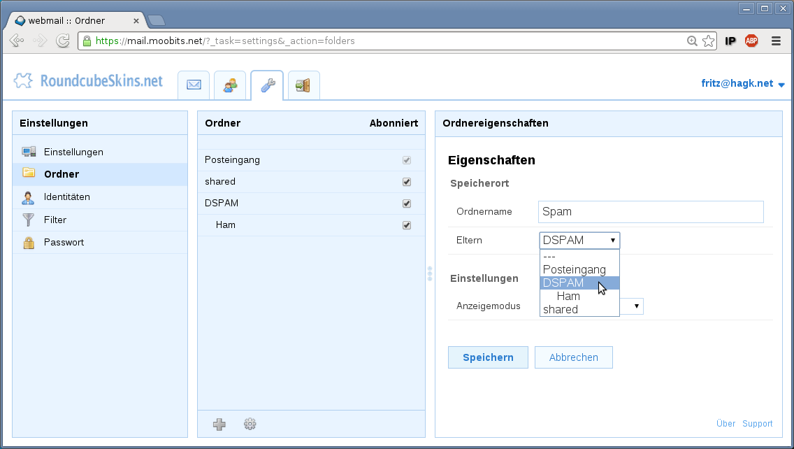 die Auswahlbox "Eltern" = DSPAM. Mit "---" wird der Ordner nicht hierarchisch untergeordnet.